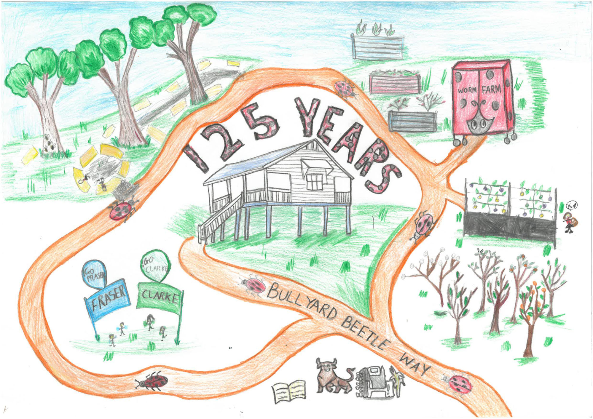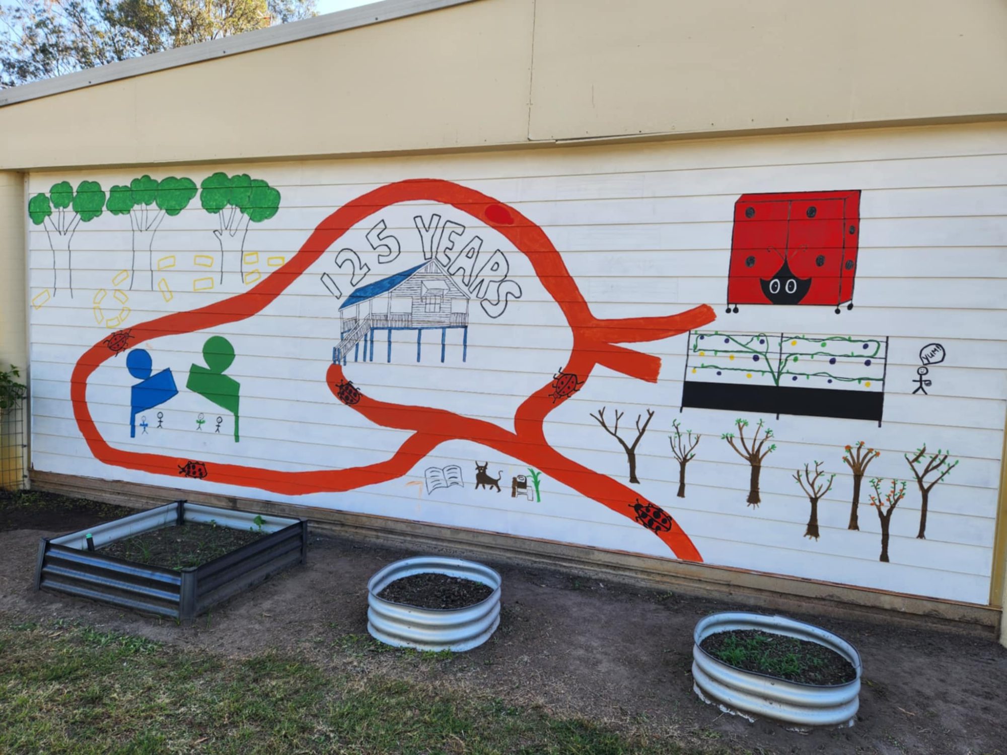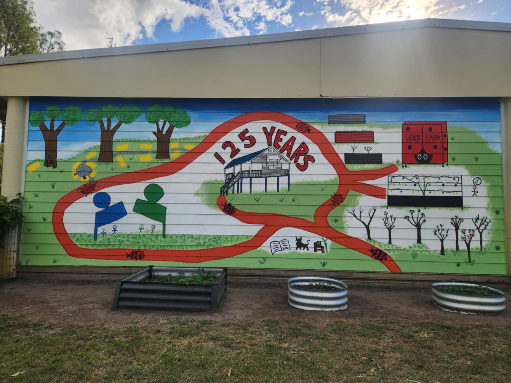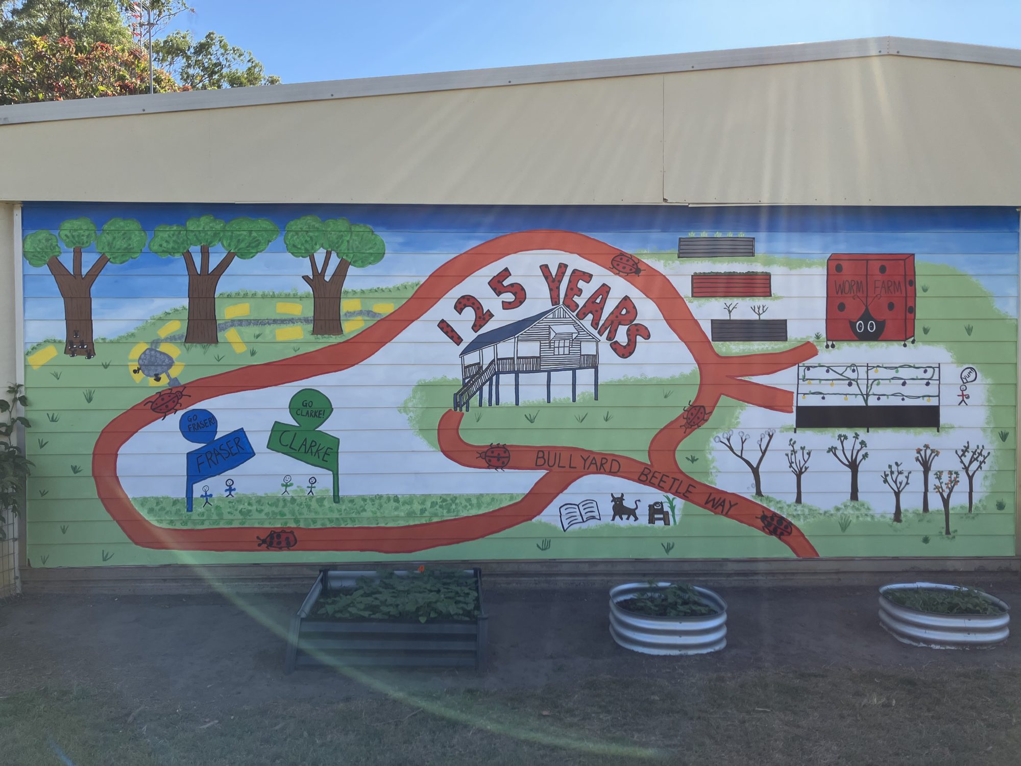 In celebration of its upcoming 125th anniversary, Bullyard State School joined the Paint Australia Beautiful campaign. The mural captures the school’s story: the arboretum and gardens, native bees, the iconic Bullyard beetles, worm farms, school houses Fraser and Clarke, and the first school building still in use today.
