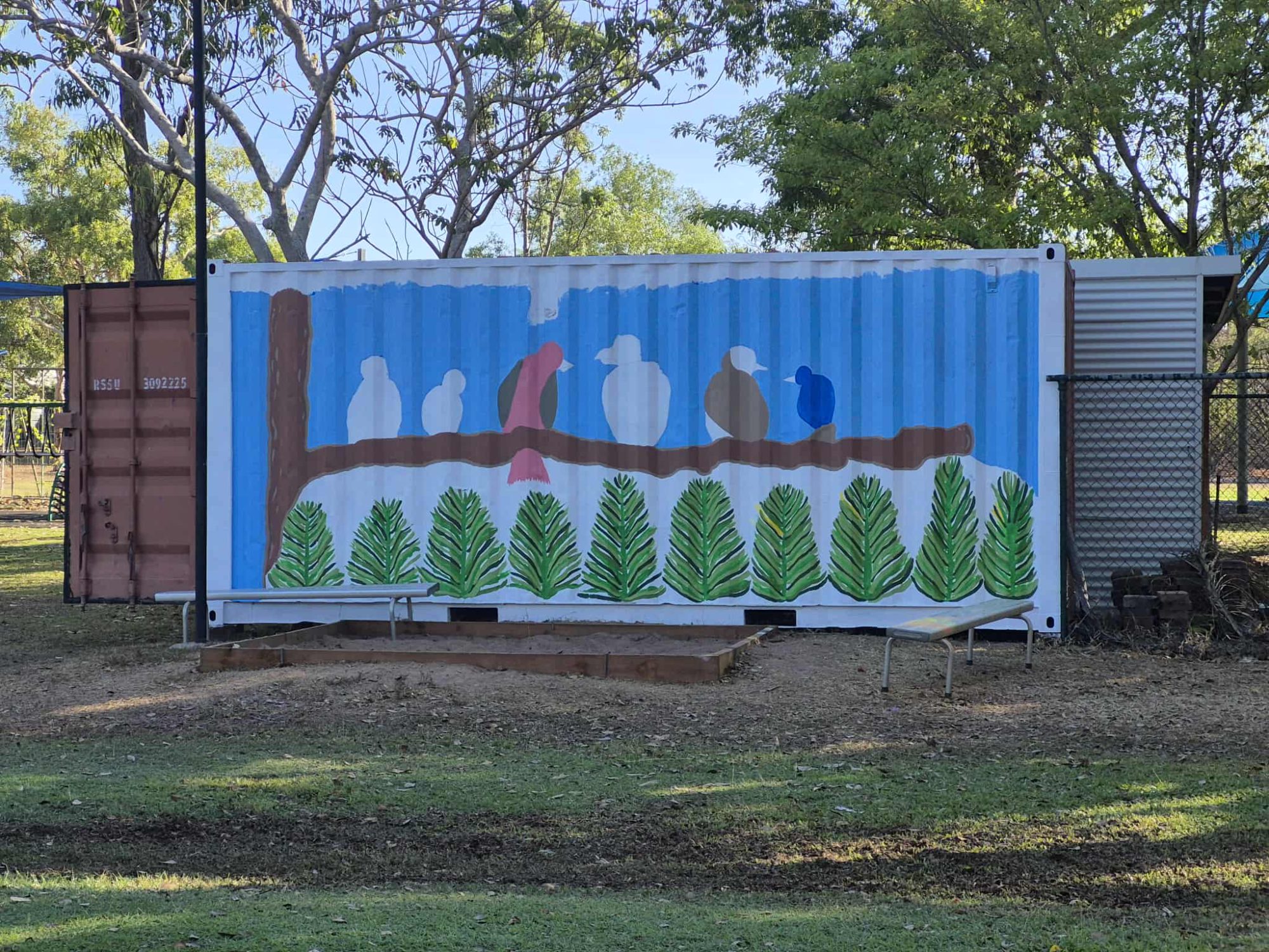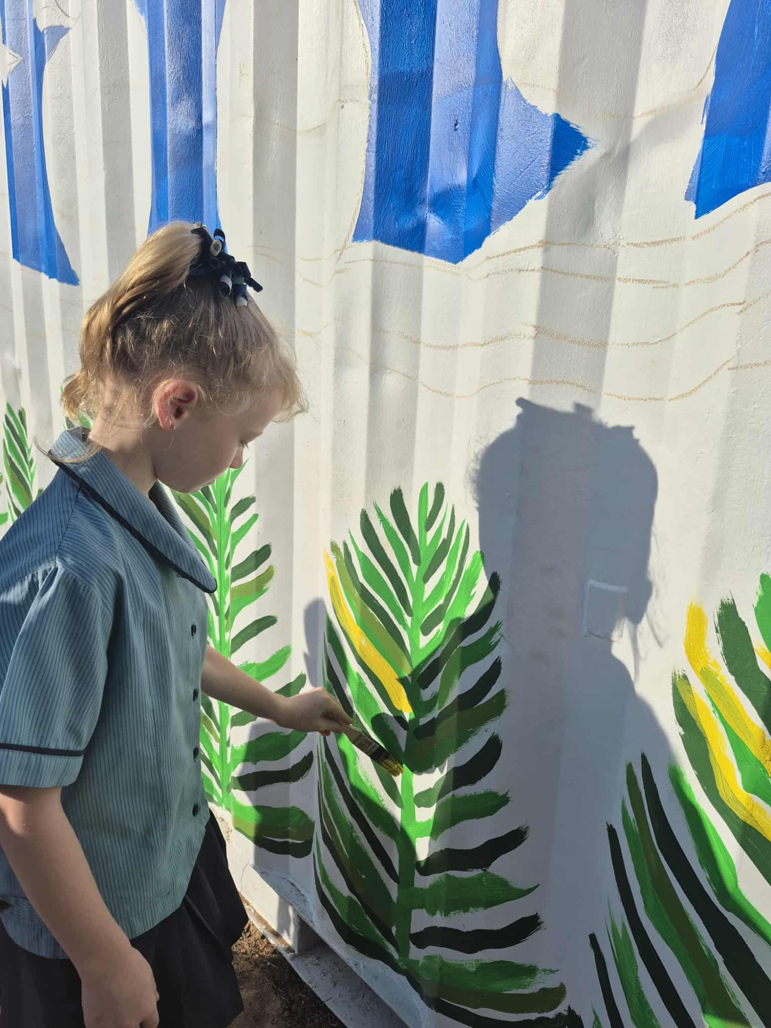 The mural is inspired by the birds that the students in year 2 drew and that we often see at our school. It will be a colourful nature piece to our plain metal shed without being an eyesore to our natural playground.