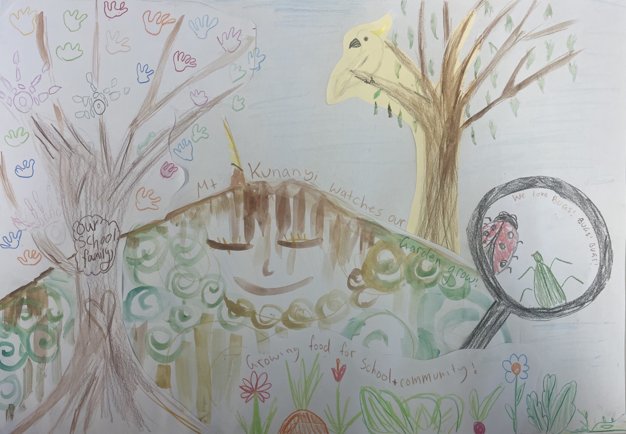 - We can see Kunanyi/ Mt Wellington from our school garden, it feels like the mountain watches over us, and sometimes has snow! It tells us what weather is coming. We will paint the mountain with a friendly face watching over the garden.