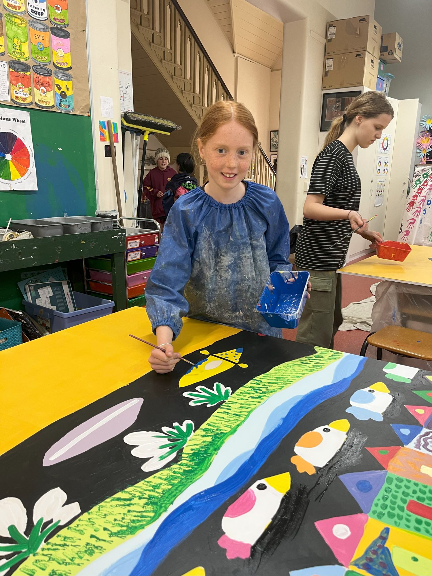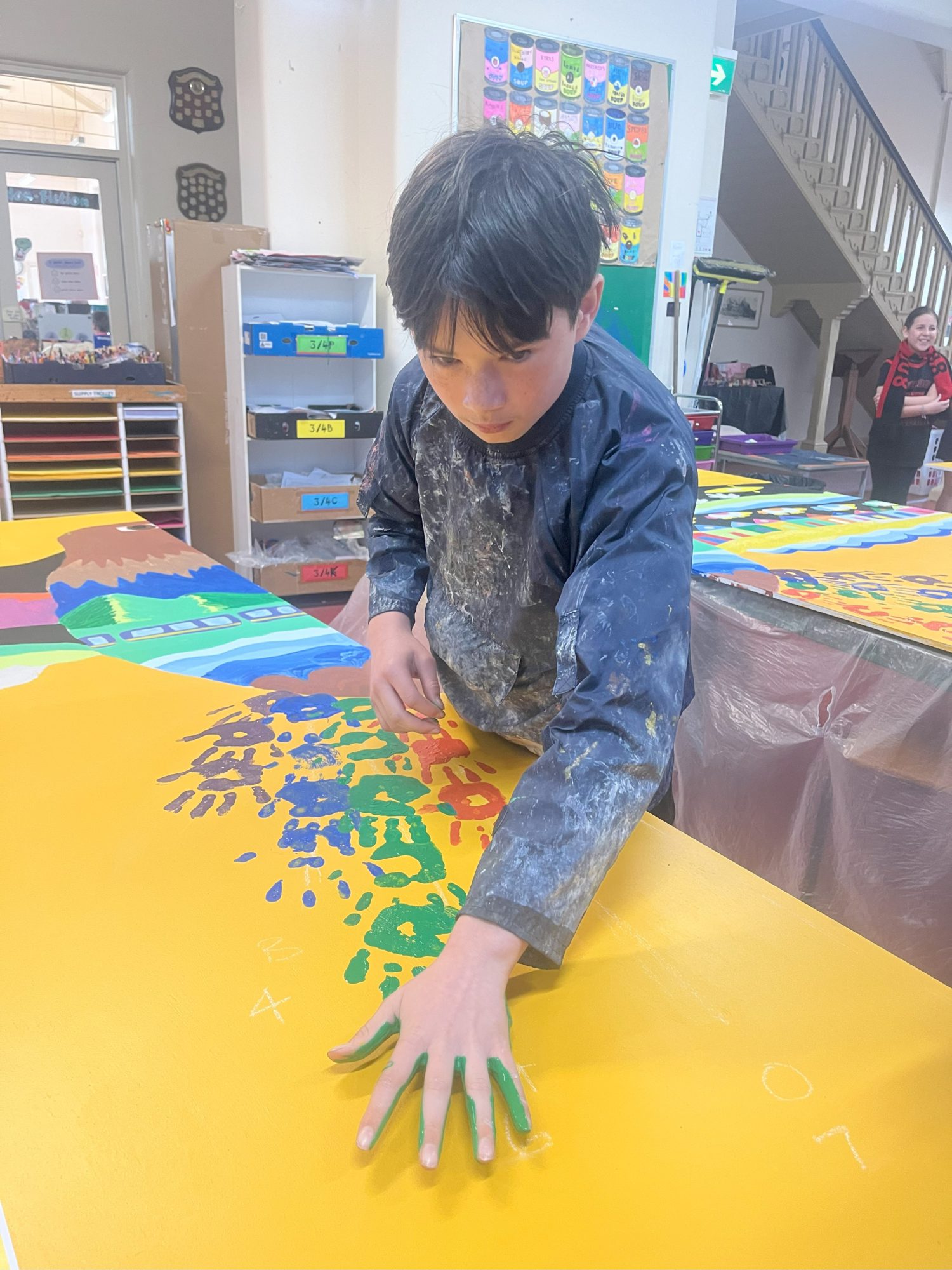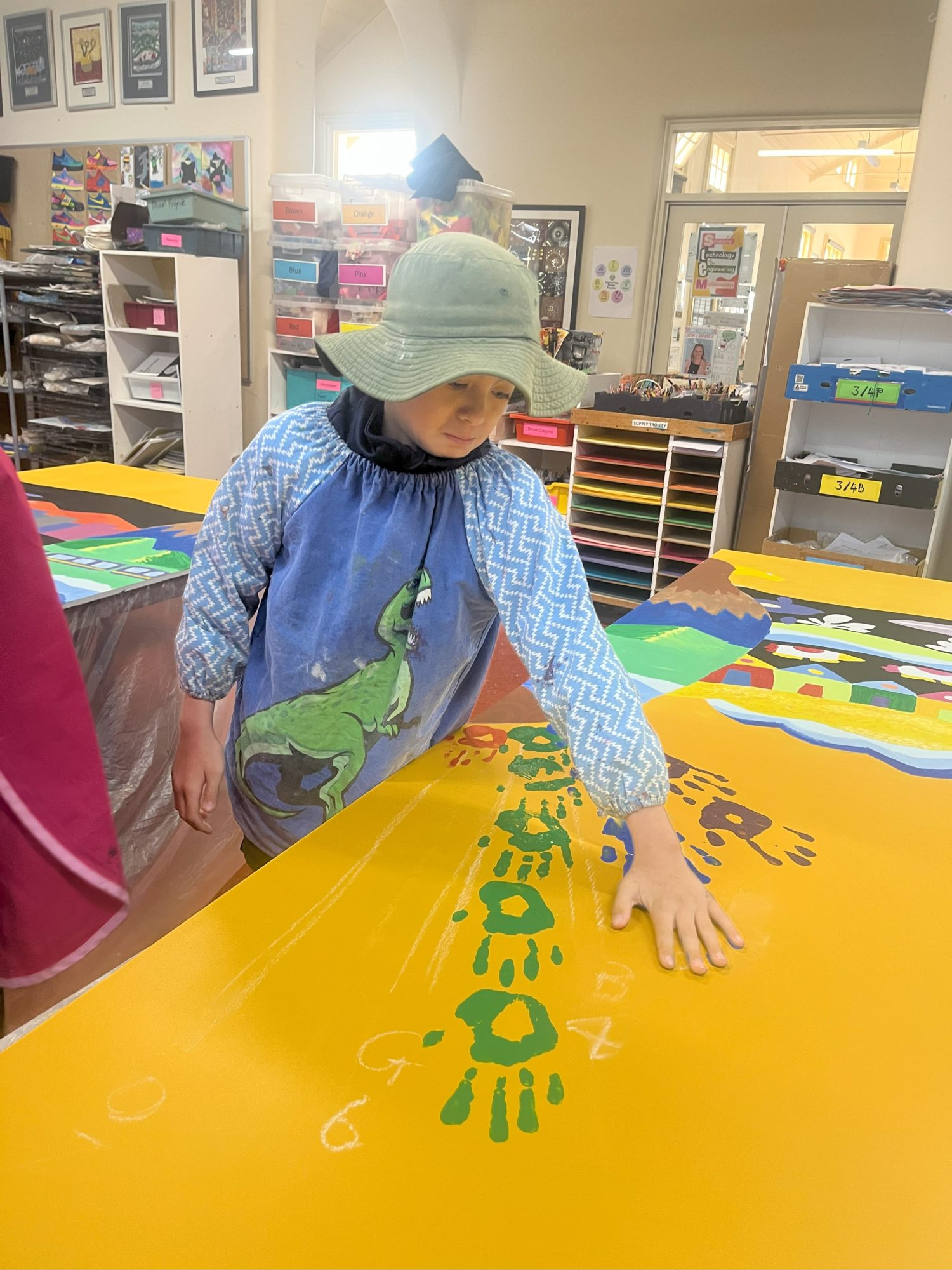 South Geelong’s entry to the Paint Australia Beautiful campaign reflects its deep ties to place, sustainability and community pride. After Maichi’s mural design was shortlisted in 2023, she was eager to submit another entry and returned with a renewed vision, this time supported by Year 6 Art Leader Aleahya, Art Teacher Mrs Walsh, and volunteer Caz. Students from Years 3–6 contributed patterns and details, while all Year 6 students and staff left handprints, making the project a shared legacy.