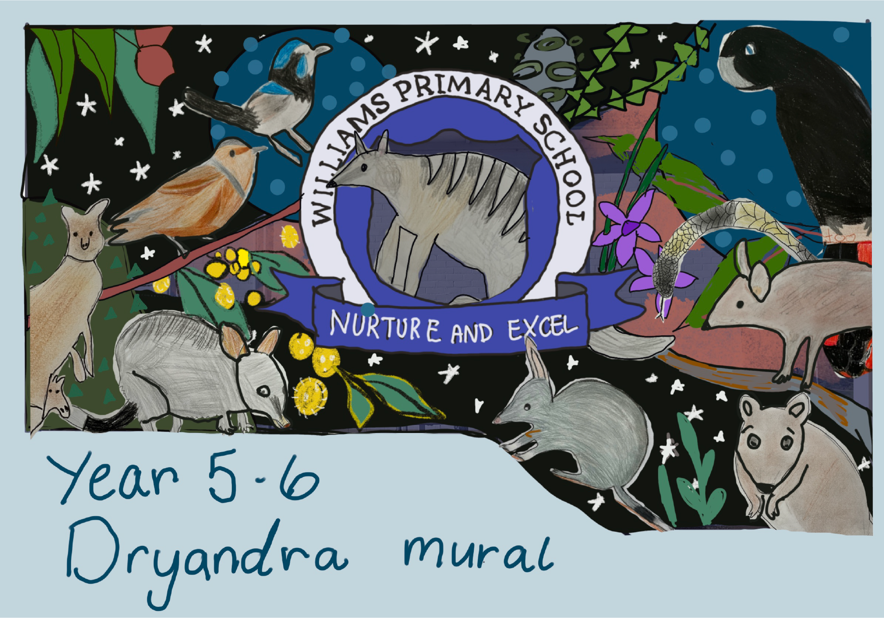 The mural created by Williams Primary students celebrates the biodiversity of the Dryandra Woodland and the school’s connection to its natural surroundings. Each drawing reflects students’ experiences and observations, bringing to life the mammals, birds, and native plants they encountered. It serves as both a visual story and a reminder of the need to protect these fragile ecosystems.